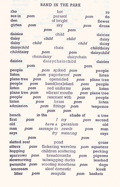 NOTE: Both ‘Band in the Park’ and the poem following - ‘Conversation Piece’ - are from ‘Central/Peripheral’, the 7th and final section of POEMS 1970-1971 (Gogmagog Press, 1972). They are reproduced in their original typesetting, as found in GOGMAGOG (pp. 53-54). While most of Cox’s poetry is meant to be read aloud, the ‘concrete’ nature of these poems requires a different approach. The preface to POEMS 1970-1971 reads, ‘Here the central, descending statement, is supported by words seen peripherally on either side, which contribute an added background on a different space/time level. The eye should feel free to roam up or down, or from side to side, until all the subtleties of meaning inherent in the relationships appear to have become realised.’ - BH/03 |