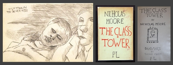 A subsequent volume was The Glass Tower, a volume of poetry by Nicholas Moore, to be illustrated by the young artist Lucian Freud. In 1943 Lucian Freud, Bettina Shaw-Lawrence and Lucian’s friend ‘Nigel Mc.’ set out for Scotland, quite probably for inspiration for Lucian’s book commission. Sandra Boselli interviewed Shaw-Lawrence for her Spring 2011 British Art Journal article Lucian Freud: a Scottish interlude. While Freud is the focus of the article, it sheds a bit of light on Shaw-Lawrence as well. The trip was subsidized by Freud’s benefactor, Peter Watson. According to Boselli, ‘Nigel Mc.’ was another of Watson’s protege’s. a selection from: Lucian Freud: a Scottish interlude by Sandra Boselli Source: British Art Journal. Volume 11, issue 3 (Spring 2011): p69. Bettina Shaw-Lawrence recollects Lucian fixing an assignation with his friend Nigel Mc. and herself to discuss the logistics of their journey to Scotland. The three conspirators met one evening upstairs at the Cafe Royal, a select location probably considered as propitious for discussing their secret plan. It was of paramount importance to prevent Peter Watson from finding out that Bettina was accompanying the two young men on this trip. He was willing to pay for his proteges, but would have refused pointblank to foot the bill where the young woman was concerned. Bettina by her own admission was seen by the influential and affluent homosexuals of London’s artistic coterie as a ‘troublesome girl’. Nevertheless, her talent and exuberance enabled her to make many friends among whom was Lucian Freud. They had known each other since her return from Paris in 1939 where she had studied art for a year. It was the start of a very close, life-enhancing wartime relationship. According to Bettina Shaw-Lawrence they developed in those early years strong emotional and artistic bonds fraught with rivalry. |