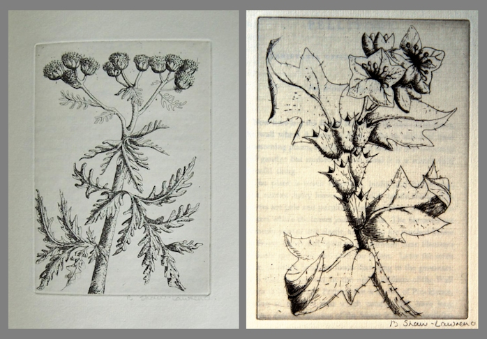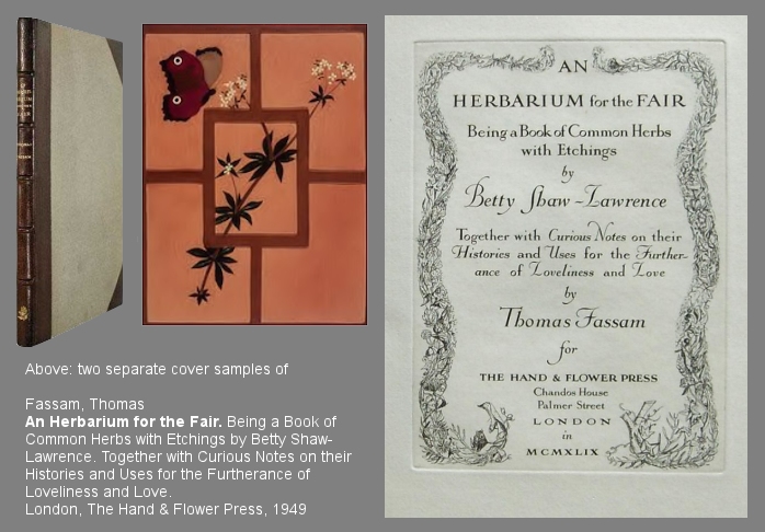 Brief description from: University of Otago, New Zealand: In an attempt to etch the likenesses of common herbs such as ‘Eyebright’, ‘Golden Rod’, and ‘Darnel’, and provide their properties and uses, Betty Shaw-Lawrence not only read numerous old herbals, but also physically examined many samples of plants. Her advertisement to this limited edition of 260 ends: ‘Read, then, what is written here; mark it if you please; learn it if you will; but be chary before you inwardly digest it…’.