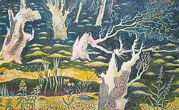 Cox painted another, similar forest scene in 1948/55 (not shown), as well as an elimination linocut of a 'Forest Bomb Crater' in 1950 (included in this exhibition).