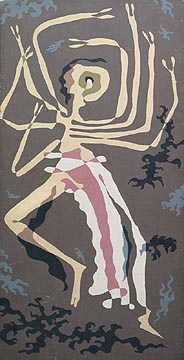NOTE: Dancers appear in Cox's art throughout his long career. There exists, from the 1930s, a series of photographs of Cox's then future wife, Wyn Cresswell, which show her in eastern costume in a variety of elegant dance poses. 'Dancer' takes a number of such positions and portrays them at once, in multiple perspective. There is also a drawing (not shown here) from the 1930s titled 'The Eternal Footballer', which shows a similarly abstract figure with legs flailing in all directions. See also 'The Last Dance' (1948) in this exhibition. |
