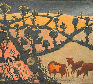 NOTE: The texture of this painting has resulted from Cox building layers of colour, and then ‘moving’ the top layers to reveal the colours underneath. Also, further texture is achieved by scratching the seeded dandelion head into the surface. It is particularly successful in creating a luminous image by utilizing a light outline around the dark trees. The atmosphere, if not the style, is reminiscent of the visionary landscapes of Samuel Palmer. |