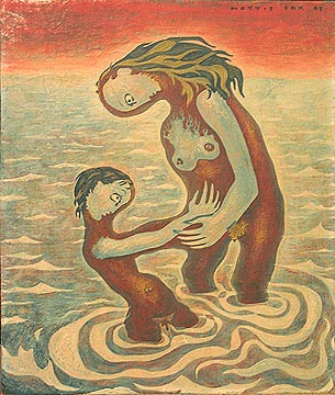 Note: Preliminary drawing is included in GRAPHIC YARDARM , tho the title is given as ‘Mother and Child Bathing’ with an incorrect date of 1948 (the title in GRAPHIC YARDARM in fact refers to a very similar painting of the same subject executed in 1948, which would have been very easy for Cox to confuse with ‘Mother-Love in Water’). The surface of this painting shows a great deal of attention, with a build-up of colors, which Cox then scraped in fine lines, in swirls and crosshatching. Compare the figure of the woman with the 1947 linoleum block ‘Nude. Continuous Line - From Drawing’. |