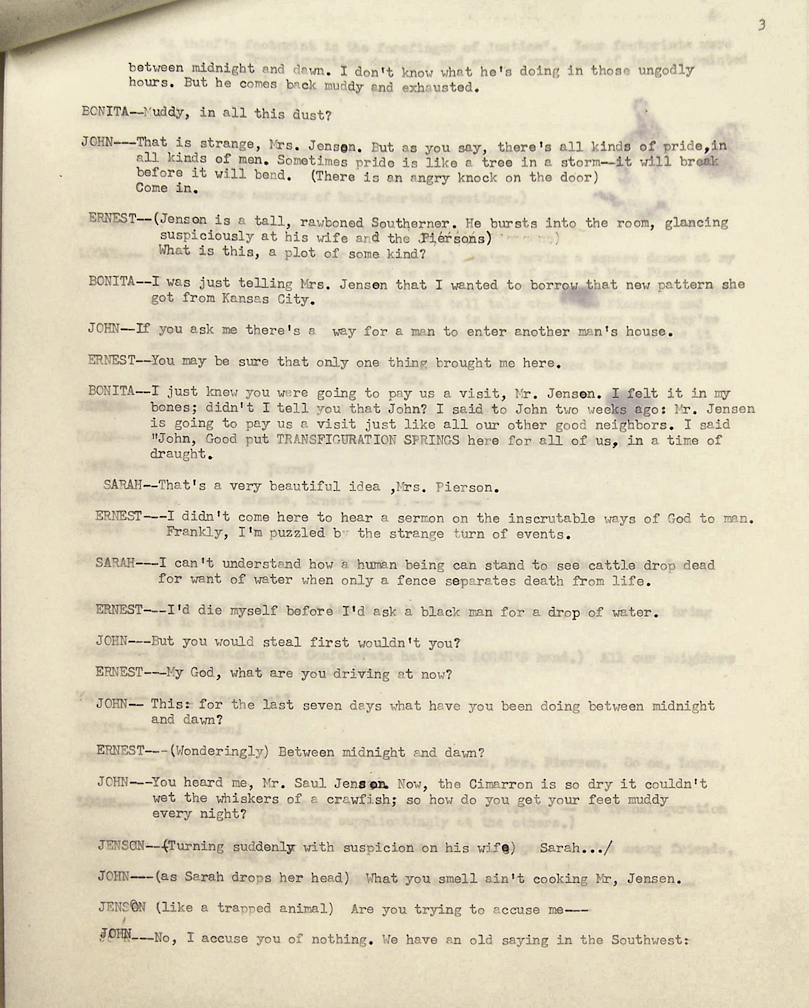...�Transfiguration Springs,� revolves around a native white Virginian on an Oklahoma ranch who refuses the offer of his black neighbor to share his water supply during a drought. Rather than accept a favor from a black man, he steals his water, and his attitude changes only when his neighbor rescues the white man�s wife from a dangerous situation. -- from Melvin B. Tolson by Joy Flasch