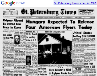 Mrs. Rosa B. Moore received the Spingarn Medal at the Conference on behalf of her son. The Moore's daughter, Evangeline Moore, who was not home at the time of the bombing of the Moore's home (see news article below), has worked to promote the story of her parents' contribution to the Civil Rights Struggles of our time.