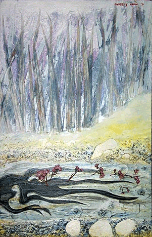 1971 (26.5” h x 17” w) Mixed media: (acrylics and varnish, with embedded grass, flowers, pebbles, and paper cut-outs on masonite).