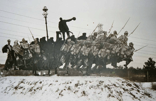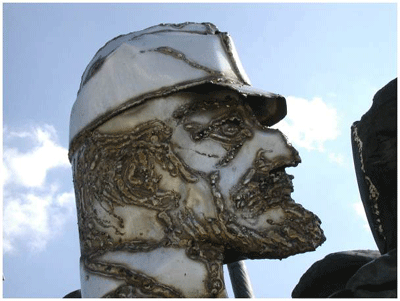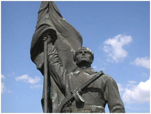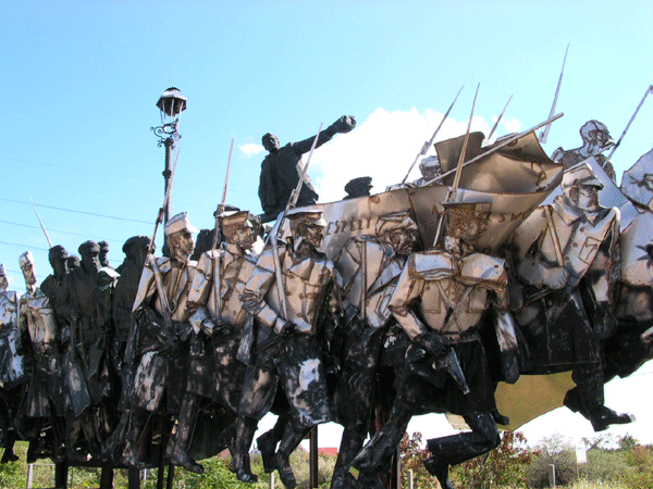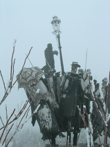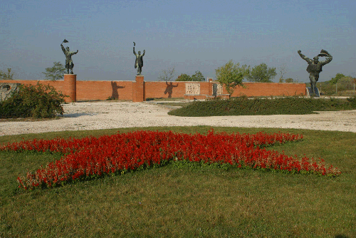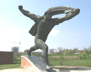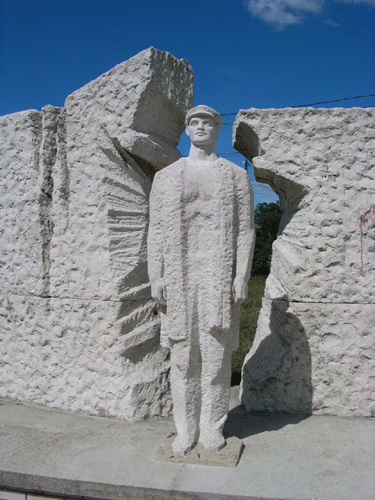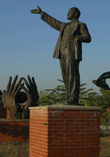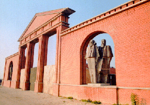 We missed the stop for Szoborpark. A young backpack couple had gotten off the bus; I'd noticed an impressive brick wall with three large portals, braced by stone buttresses and topped with a classical capital, like nothing so much as the facade of a church that had never been finished; then dark bronze heads in dynamic attitudes slid past; and at my wife's question I ran to the bus driver, who with a friendly laugh jerked his thumb back toward the stop we had just left. But he didn't make us wait till the next regular stop; so we hiked back a quarter-mile against country traffic, and turned in at the churchly brick facade, to be greeted, in the near niche, by a giant Lenin. This � not at all the terminus of the bus route � was Szoborpark (in English, Statue Park). From inattentive reading of our Budapest guidebook, and the bright red ad on the standard tourist map, I had expected a large green public park to which the old statues of the Communist era had been hauled for the liberated masses to picnic beneath and let their children climb in pleasant vengeful mockery of the symbols of the dictatorship, now reduced from monsters to clowns. Not quite. Far from being a large park in or on the edge of the city, it's miles out of town, in hilly countryside marked by expensive new American-looking suburban homes; it's tiny; and it's surrounded by weeds, wild flowers, and other scrub not yet cleared for the encroaching homes. You cannot enter the park through the facade's triple entrance, between the Socialist Realism Lenin, on your left, and on your right a somewhat more "modernistic" duo of Marx and (a step behind) Engels, huge granite masses and lines reminiscent of Stonehenge or Easter Island. The three portals are gated, inside, by a stockade fence. The gate (almost) never opens. (This appears to be meant to be symbolic.) But you can simply step around the facade and up to the ticket counter cum souvenir shop, manned by two formidably smiling middle-aged women who don't speak any more English than I do Hungarian. Among candy and soft drinks for sale there are also theme-chotzkes, including mugs and T-shirts; the latter ranging from a red "MARX PARK" with squat Marx-Engels-Lenin-&-Che glaring like Cartman-Stan-Kyle-&-Kenny, to a long revolutionary exhortation on a photo of Che Guevara that does not, in fact, sound at all ironic. CDs of the "Internationale" and other Socialist choral works are also in stock. With the multi-service Budapest Card, the 600 HUF (Hungarian forints, or $3) entrance fee is waived; but the 600 HUF English guidebook is indispensable. Behind the brick facade the park � conceived and financed by the post-Communist Budapest Assembly (city council) � is shaped as a series of horizontal figure 8 gardens through which a straight path passes � to dead-end at a brick wall. (This also seems to be meant to be symbolic.) Gravel walks edge ovals of patchy lawn; some grassy patches also cropping up in the gravel. In the center of it all on a circle of grass lies a star of red flowers (which used to lie in a greater circle at the Buda entrance to the famous old Chain Bridge across the Danube to Pest). The figure 8's ascend tree-like from (to my taste) the dull to the fascinating. For much of the park the guidebook is worth more attention than the artifacts themselves. There are many plaques and conventional larger-than-life statues in simple heroic poses. Quite a number are called Liberation Monuments, honoring the Soviet troops who drove out the Germans and destroyed the Hungarian fascist Arrowcross at the end of World War II. Even here ambiguity intrudes a bit. One giant Russian soldier, legend has it, might actually have been commissioned before the war as a giant Hungarian soldier, modeled by the son of the Hitler-friendly dictator Admiral Miklos Horthy. ![]() Another monument has acquired unintended ambiguity from the post-1989 perspective. It's a massive breached white wall of baked limestone, nearly two-meters thick, with the heroic white baked limestone figure of a worker standing forth out of the breach. The wall was originally meant to represent the fascist/bourgeois oppression of the workers. Today a first-time viewer cannot help thinking of another wall and a different meaning. ![]() Not only Lenin but one or two (to non-Hungarians) obscure personages stand with right arm extended in a gesture of ... demonstration? benevolence? We've seen pictures of Lenin statues like this before. ![]() Having led the Bolshevik revolution, taken over the state apparatus of Russia, and reorganized the Czarist distribution of power, Lenin can be said to have given at least the Russian proletariat a world they'd never had before. Taken and given. One can muse how that magnanimous pose of one man giving a world to millions tends to conflict with the theory of the proletariat collectively seizing the means of production for themselves. Praxis and theory often conflict, but one wouldn't expect to see this one fact of praxis idealized as the great thing to be collectively grateful for. Other dynamics were in play, of course, and Lenin did not order his own statues; Stalin did. O.K. But who are these other putative benefactors with arms extended; and, more to the point, who ordered their statues, and why? As the guidebook makes clear, most of the individuals memorialized did not live to see the Hungarian Communist regime establish itself. They were founders or early leaders of the Hungarian Communist Party (or its successor Hungarian Socialist Workers' Party); but most importantly they were martyred by the Horthy regime before World War II, or by the Arrowcross or Germans during. There are no statues of or tributes to the men who set up the postwar Communist regime, or (with the exception of the deceased Ferenc Munnich, one of the benevolent arms) who perpetuated it after suppression of the Hungarian Revolution of October-November 1956. One big reason for this, of course, is the offic