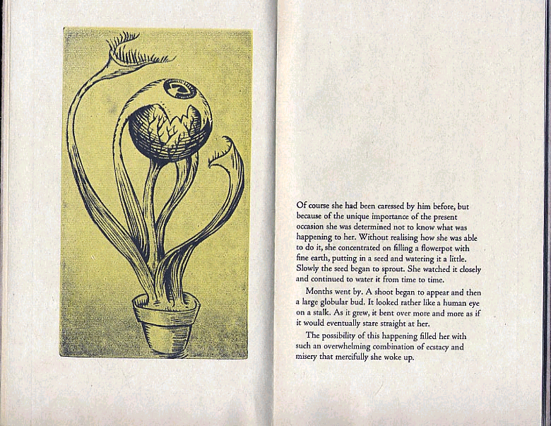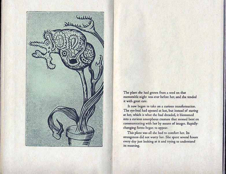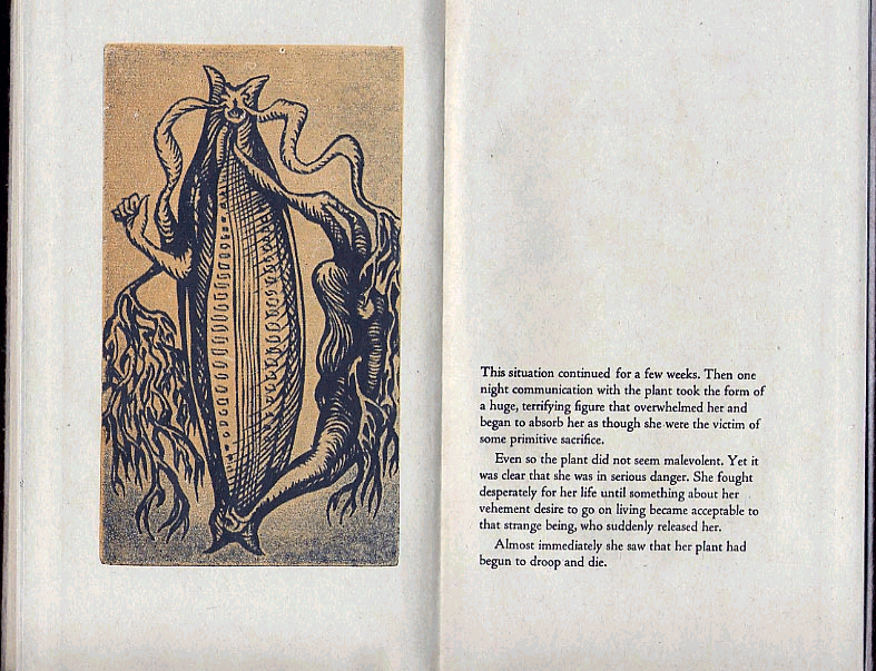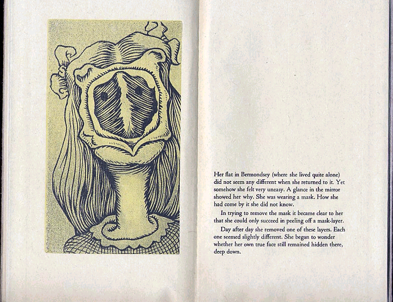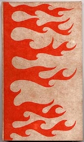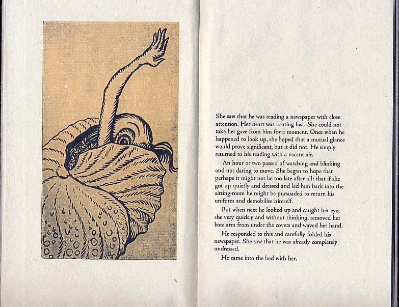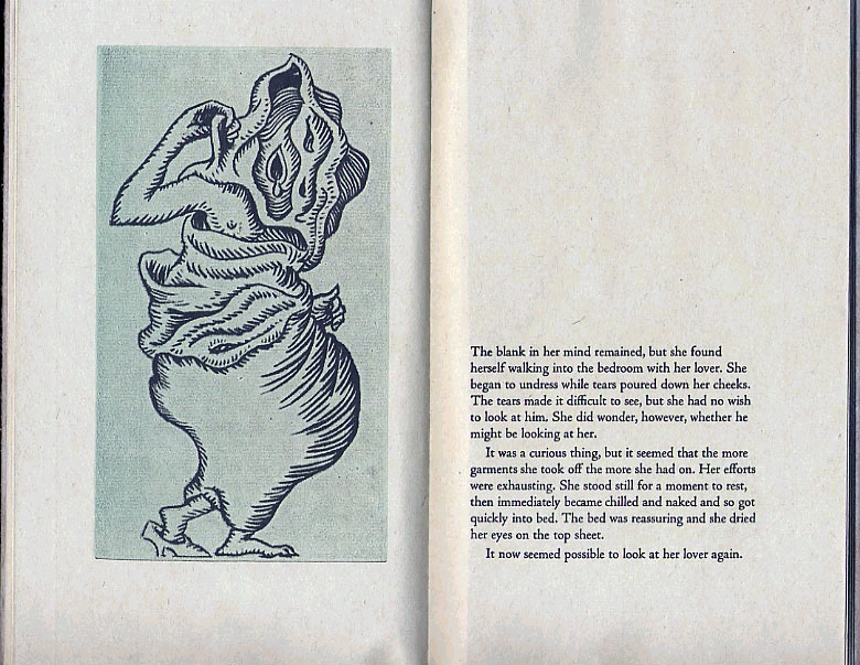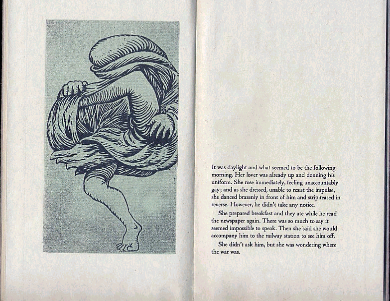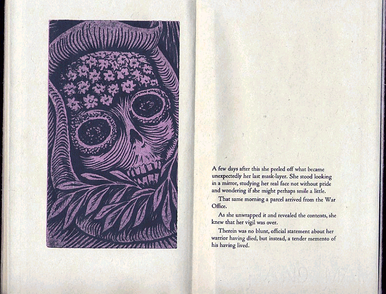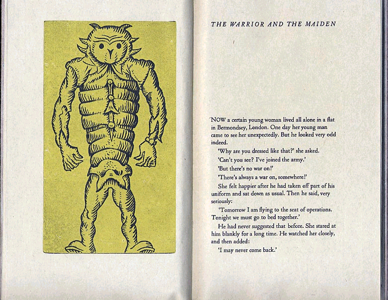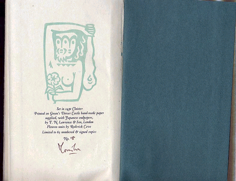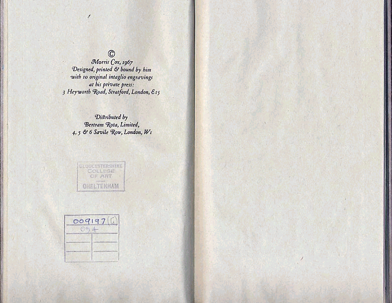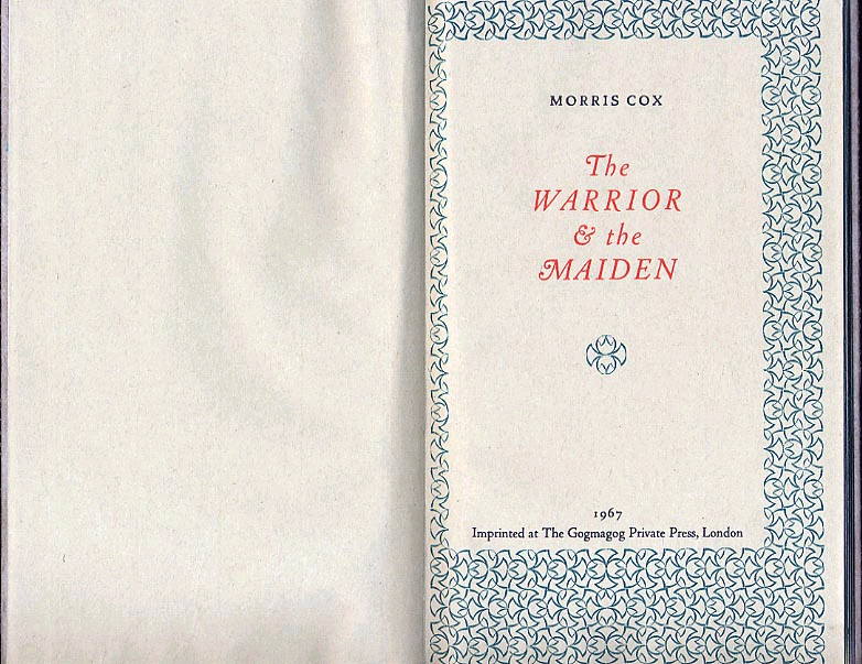 The text of THE WARRIOR & THE MAIDEN was written on the 4th of April, 1964 under the provisional title �Love & War�. It was printed as a Gogmagog Press book in 1967/8 with ten �reverse-offset� linocut illustrations (which he refers to on the copyright page as �intaglio engravings�). The relatively short four year gap between the writing of the text and the production of the book represents near contemporaneity of word and image, somewhat unusual for Gogmagog books. The use of linocuts is of note, as he had for several previous books been exploring the possibility of �nature printing� to great success. The illustrations for THE WARRIOR & THE MAIDEN, then, mark a return to more linear depiction that he would also use in a later Gogmagog Press volume, MAGOGMAGOG, which Cox noted as being �perhaps my favorite book�. Alan Tucker�s observation that every Gogmagog production tells the reader how it is to be read holds true for THE WARRIOR & THE MAIDEN. The book itself is bound in white felt, which has a flame pattern printed in red-orange. It comes in a slipcase covered in vividly striped Japanese paper. Of this binding Alan Tucker has written, �The slipcase imprisons the book (the stripes of the Japanese patterned paper make an interference pattern of bars seen against the light) which has to be pulled from it like a sword from a scabbard, releasing fire and war).' (GOGMAGOG 40) Of the text and images, Colin Franklin has written, �A clinical chill in the strange episodes, reflecting dreams in a night of poor sleep rather than any rational narrative, is reflected in the themes and colours of prints precisely cut for full type measure opposite the half-filled passages of text'. (ibid. 146) These two observations by Tucker and Franklin effectively communicate the integral marriage between text, image, and design. THE WARRIOR & THE MAIDEN, like all Gogmagog Press books, is an object whose meaning does not rely on any one facet. Instead, its meaning is created through the interaction of its various elements; text, images and binding are inseparable. Joined together they make a complete work of art. This Virtual Facsimile of THE