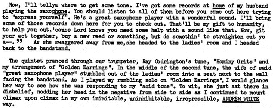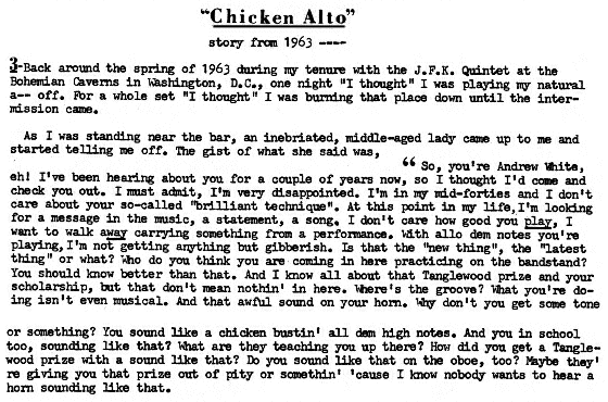 "Chicken Alto" is reprinted with the permission of Andrew White, a saxophone legend who has self produced more than 48 albums. It is an excerpt from his recently released autobiography, “Everybody Loves the Sugar - The Book,” which is released to coincide with the 30th anniversary of his own company, Andrew’s Music. In his own inimitable and shameless way, Mr. White plugs the book thus: “ - See how my life has all pompously come together and/or comedically fallen apart over the past fifty-nine plus years. Gallop with me, “Andrew-The Zorro Sax”, all through the pastures, pleasures and pain of racism, religion, love, sex and music. All complete with my perennial, suggestive prurience, total political incorrectness and fiendishly, pious irreverence...... Laff yo a- - off! - 840 Pages - 16 Pages Of Photos - Hard Cover - Dust Cover - Gold Stamped - Glued - Stitched - And Full Of Laffs!!!!!!” Copies may be obtained directly from: