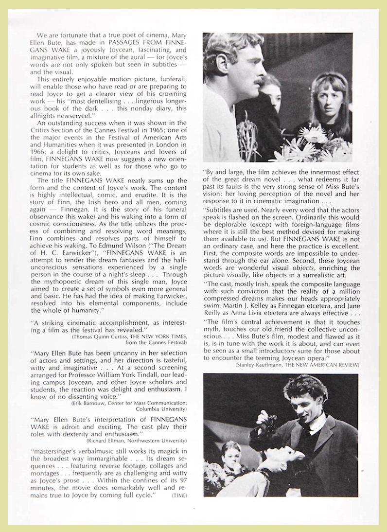 [Promotional flyer for the film, Finnegans Wake] Page [2] Author: Grove Press. Film Division Place of origin: New York Date: [1973] Physical Description: 2 p., 28 cm. Language: In English Part of: Bute, Mary Ellen: Mary Ellen Bute Papers: 1907-1985 |